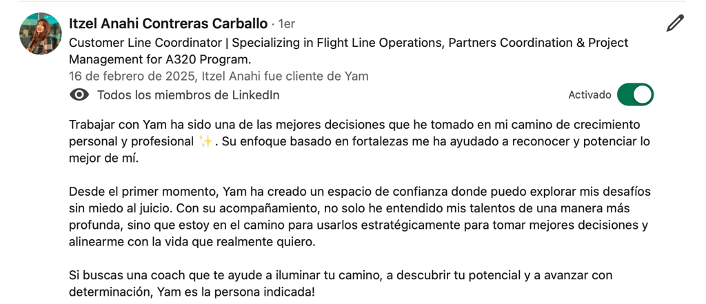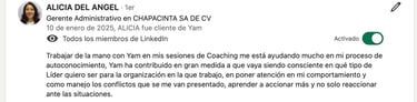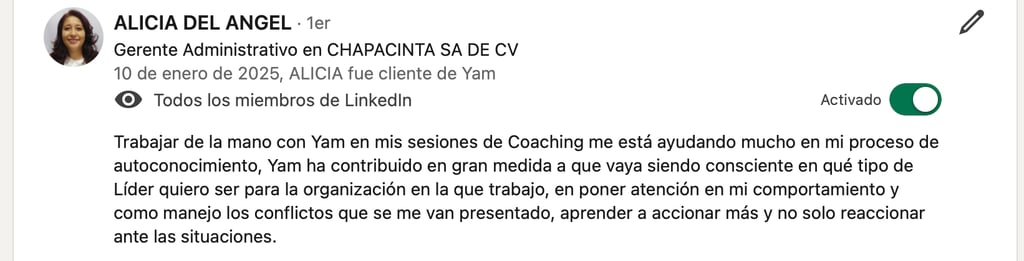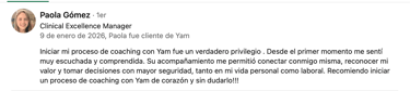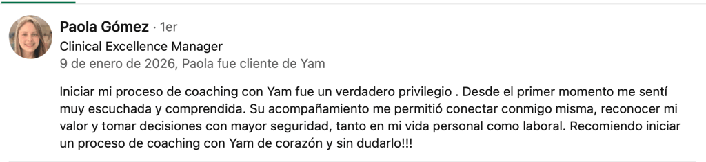 Trabajar de la mano con Yam en mis sesiones de Coaching me está ayudando mucho en mi proceso de autoconocimiento, Yam ha contribuido en gran medida a que vaya siendo consciente en qué tipo de líder quiero ser para la organización en la que trabajo, en poner atención en mi comportamiento y como manejo los conflictos que se me van presentado, aprender a accionar más y no solo reaccionar ante las situaciones.